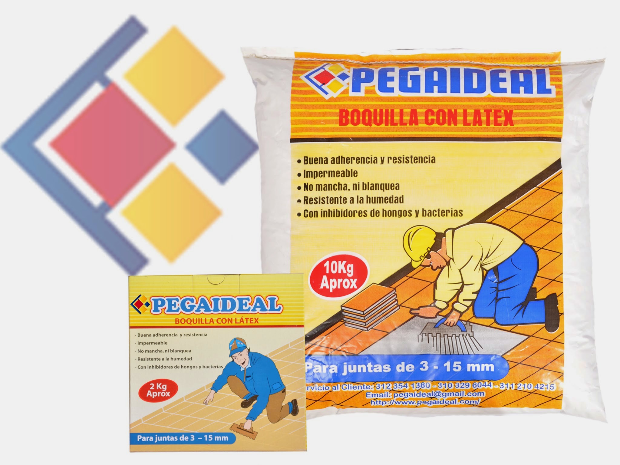 PEGAIDEAL BOQUILLA CON LATEX es una mezcla adhesiva altamente impermeable, derivada de los mejores cementos, arenas finas, colorantes y productos químicos que inhiben el crecimiento de hongos y bacterias además de proporcionar características de flexibilidad y manejabilidad.